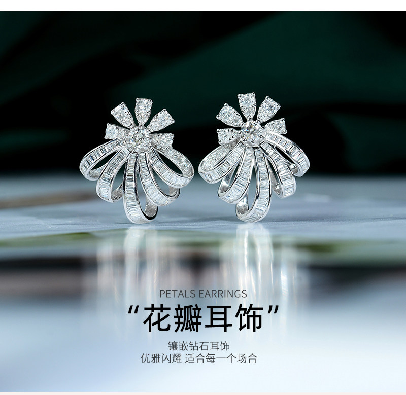 • 俊皇珠宝 纯18K金T方豪华镶嵌钻石耳饰 花瓣线条造型耳饰A