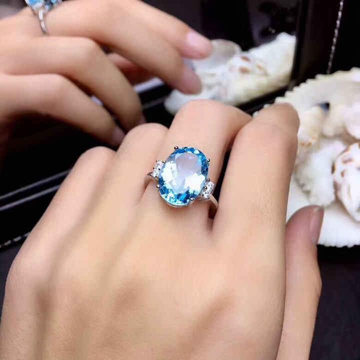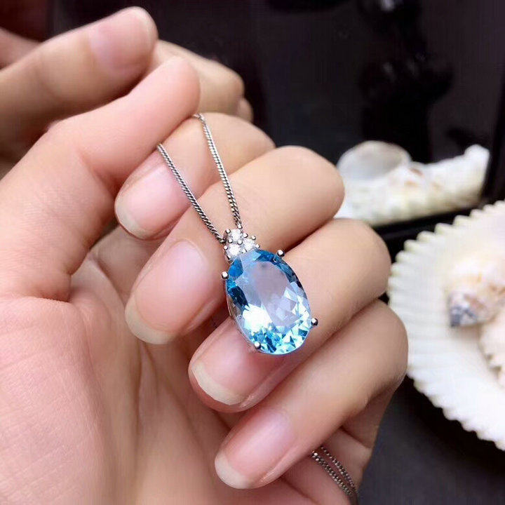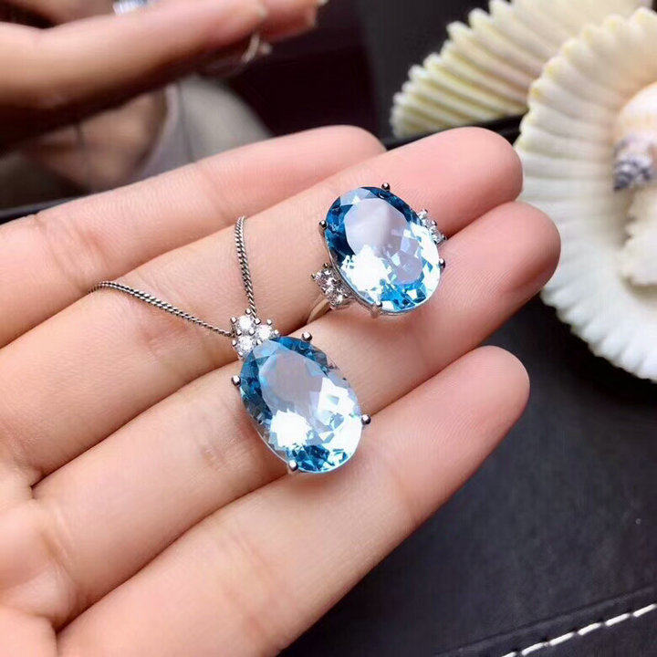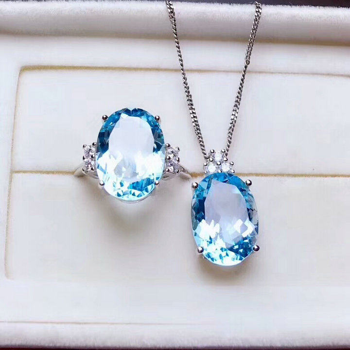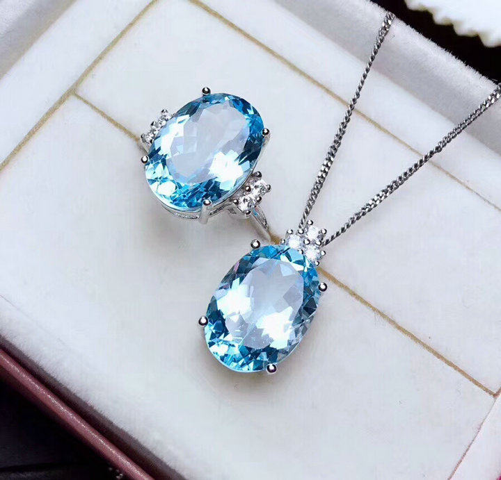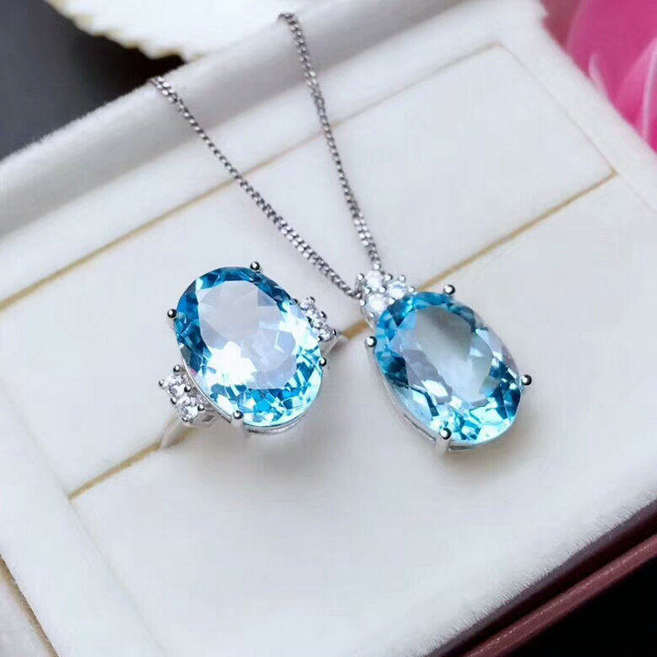 • 天然托帕石戒指吊坠女s925纯银日韩简约蓝宝石水晶首饰套装带